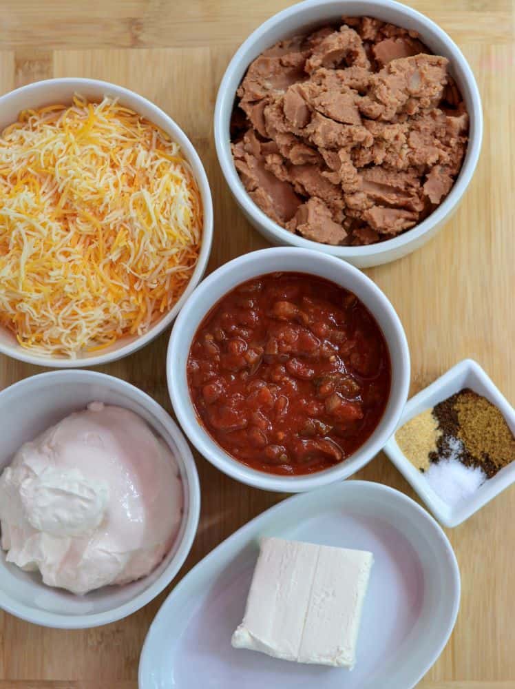This Cheesy Refried Bean Dip recipe uses just a handful of simple ingredients. Refried beans, salsa, shredded cheese, sour cream, cream cheese & spices. You can top this dip off with all kinds of fun stuff if you’d like – scallions, jalapenos, black olives.