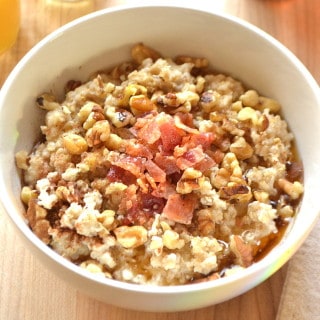 Bacon Oatmeal. A hearty, sweet & savory breakfast. Quick to make in the microwave with Quaker Oats, bacon, pure maple syrup, walnuts & brown sugar – this delicious breakfast is a great way to start the day!