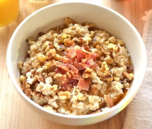 My favorite bowl of oatmeal. Made with Quaker Oats, bacon, pure maple syrup, walnuts & brown sugar – yum!