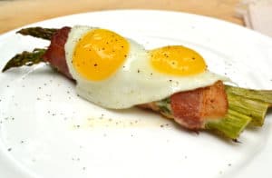 Bacon Wrapped Asparagus Bundles Topped with Sunnyside-up Quail Eggs | www.craftycookingmama.com