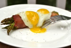 Bacon Wrapped Asparagus Bundles Topped with Sunnyside-up Quail Eggs | www.craftycookingmama.com