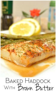 Baked haddock fillets drizzled with brown butter. Simple & delish. Brown butter takes any piece of white fish from good to gourmet | www.craftycookingmama.com | #HealthyHeartPledge #ad #haddock #whitefish #brownbutter #bakedfish #bakedhaddock #foolproof