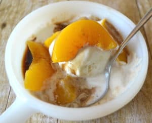 Canned Peaches Made Delicious | Save the Heavy Syrup & Reduce with Balsamic & Served Over Vanilla Ice Cream | www.craftycookingmama.com