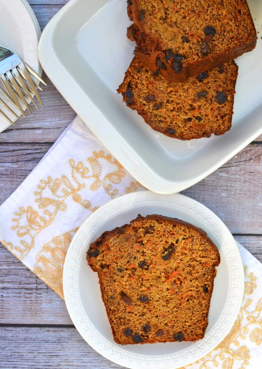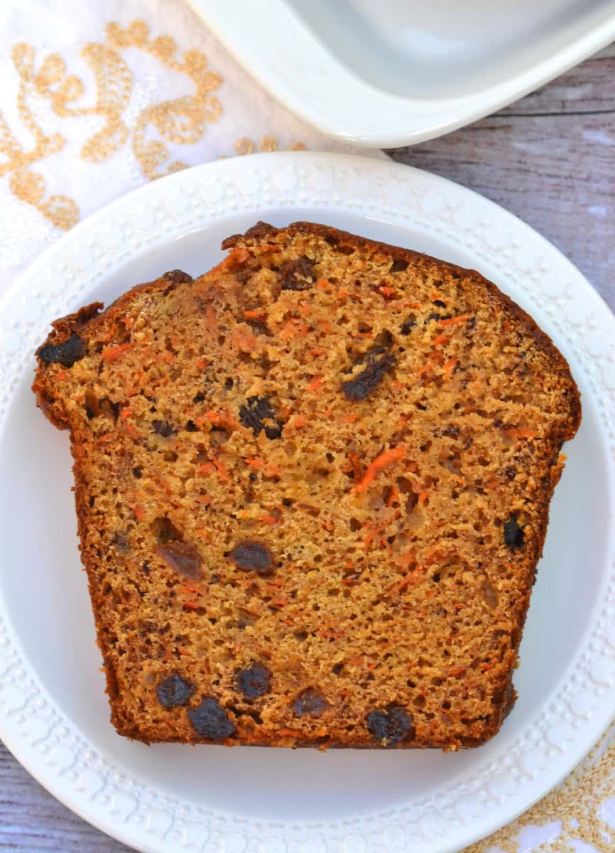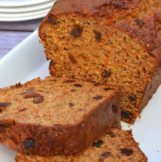 Carrot Raisin Bread is a sweet, soft & tender, delicious spiced quick bread. Made with a bunch of goodness – carrots, raisins and bananas – and no butter or oils!