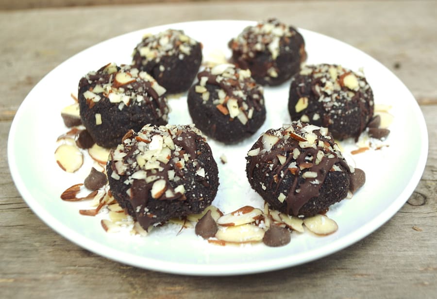 Think of them as a healthy treat inspired by an Almond Joy. No guilt involved while enjoying a few of these and they can easily be made vegan and gluten free. Actually, you’ll find snacking on these fiber rich bites will satisfy your sweet tooth and fill your belly.