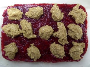 Drop tablespoons of oatmeal mixture on top of jellied cranberry – Cranberry Chocolate Oat Bars