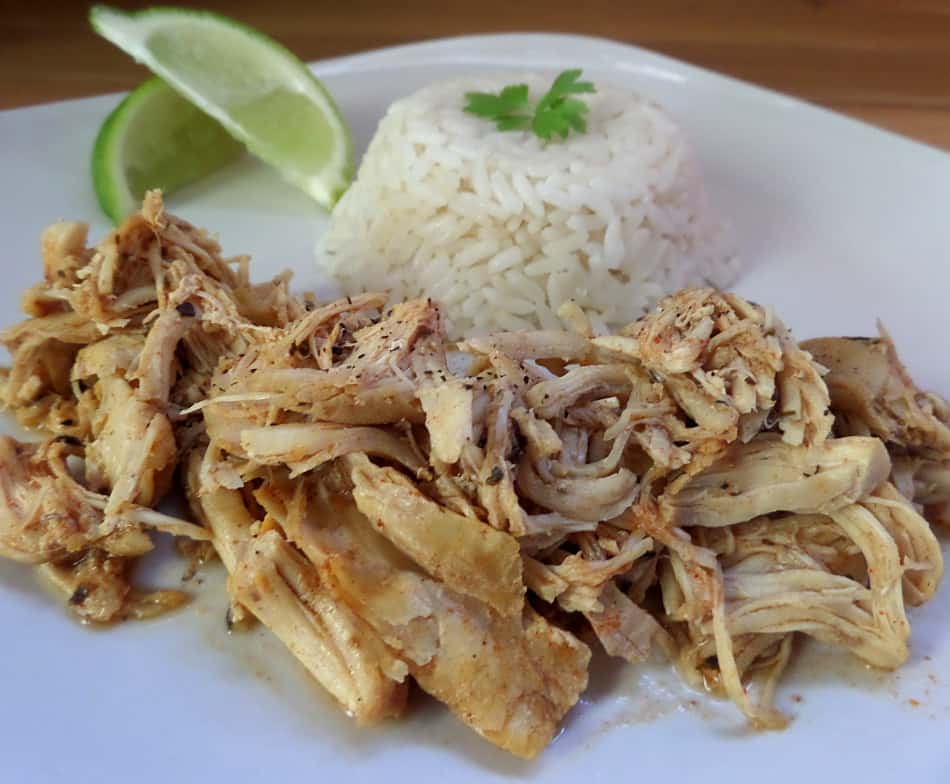 This isn’t meant to be eaten soup style, so remove the shredded chicken from the crockpot with a slotted spoon to strain all the excess broth. The broth the chicken is cooked in will be very salty – not so yum. I serve this chicken with a plate of rice and beans. On the sidelines is some chipotle sauce, avocado slices, shredded lettuce, sour cream or whatever else I might have around.