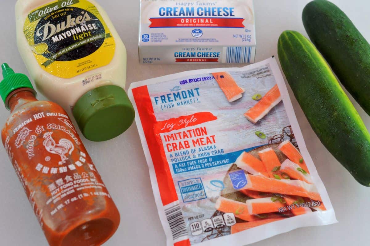 Ingredients for this Cucumber Sushi are pretty straight forward. Cucumbers, cream cheese, imitation crab meat, siracha and mayonnaise.