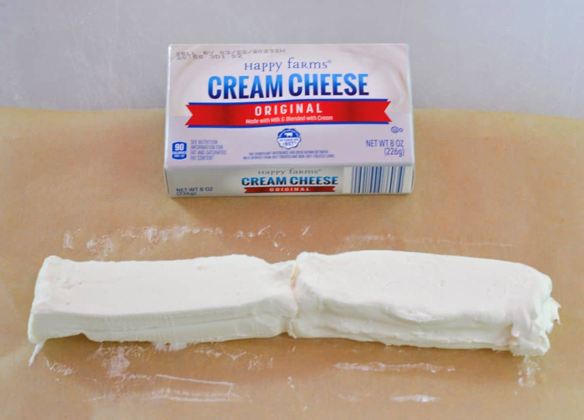 - Remove cream cheese from packaging. Cut the block of cream cheese in half length wise and transfer to wax or parchment paper. Wrap and roll it (think like a rolling pin) to round out the cream cheese. Keep cream cheese wrapped and chill in refrigerator for at least half an hour. (This rolling process makes the cream cheese super soft. Chilling for at least half an hour sets it up nicely for when you need to slice it. )