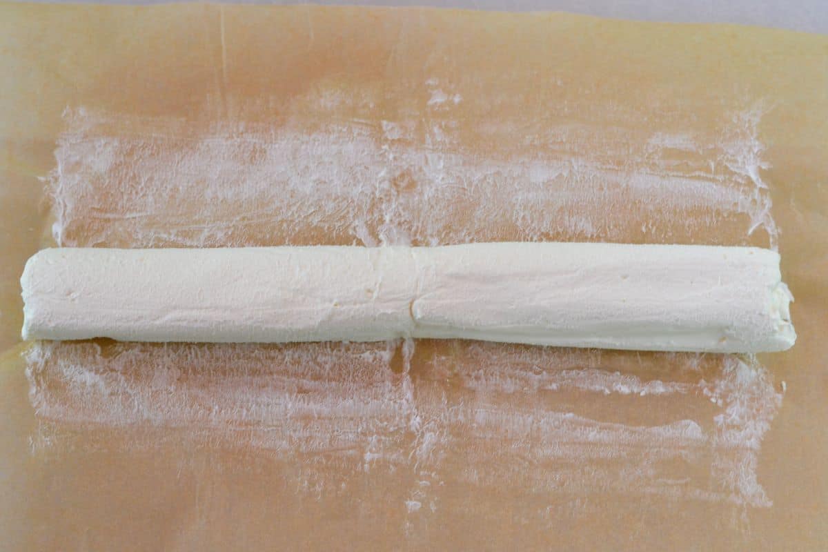 Why? The cream cheese. I cut the block of cream cheese in half length wise and transfer to wax or parchment paper. I then wrap and roll it (think like a rolling pin) to round out the cream cheese.