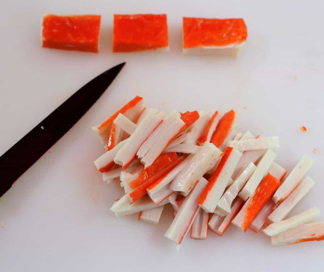 You’ll be cutting the crab meat into matchstick size pieces, so it’s easiest to work with “leg style” imitation crab meat.