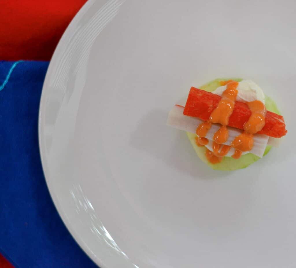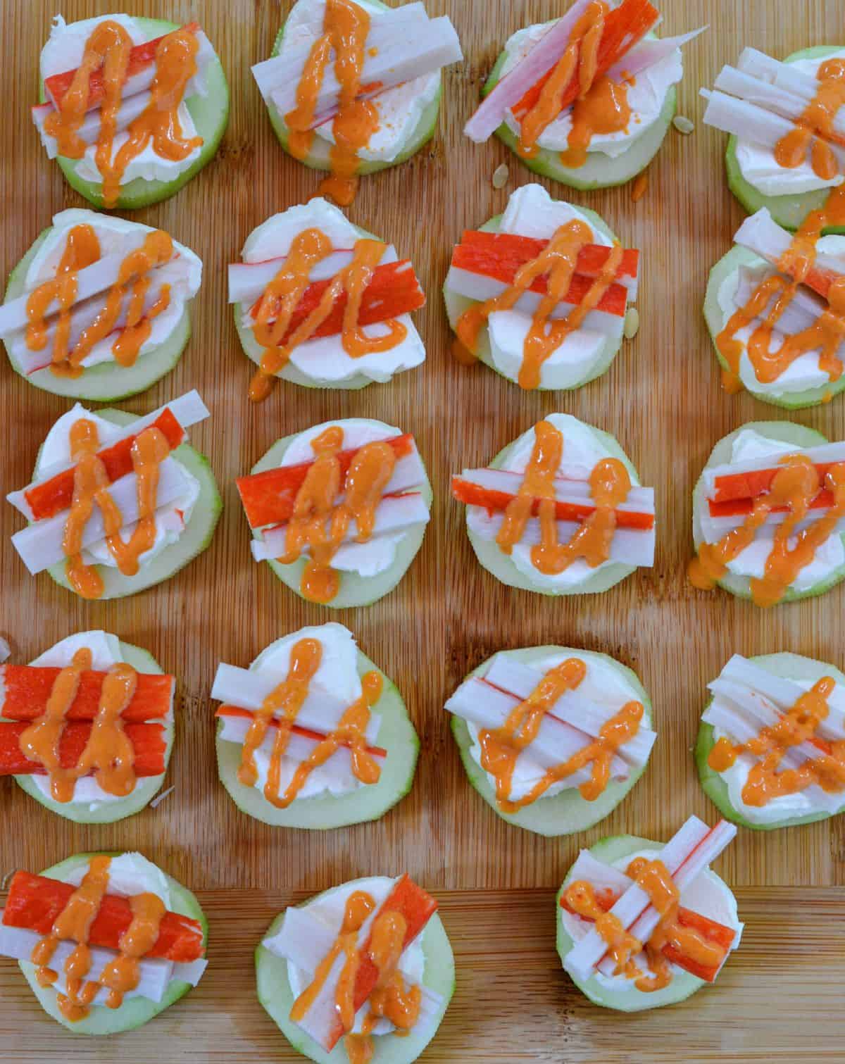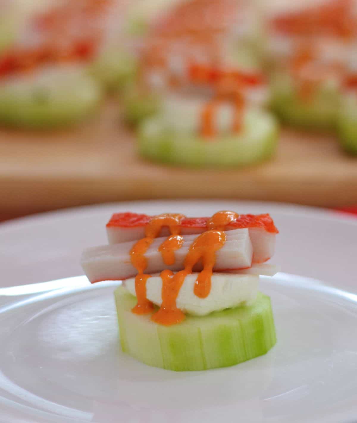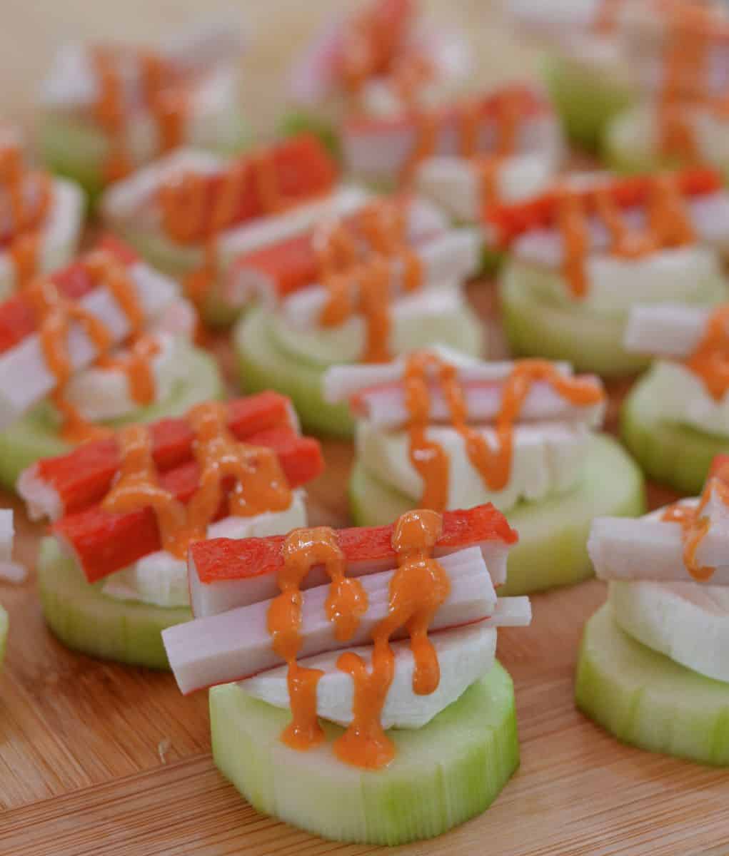 Cucumber slices topped with cream cheese, crab & spicy sriracha mayo. Delicious & super simple to assemble – anyone can make this Cucumber Sushi at home!