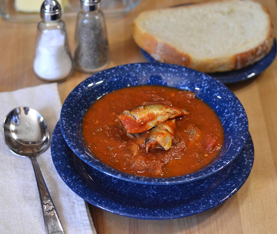 We’re working with pantry staples for this Fisherman’s Sardine Stew. Tomatoes aren’t in season and I have no fresh fish on hand. I do though, have a pantry filled with crushed tomatoes and canned goods…