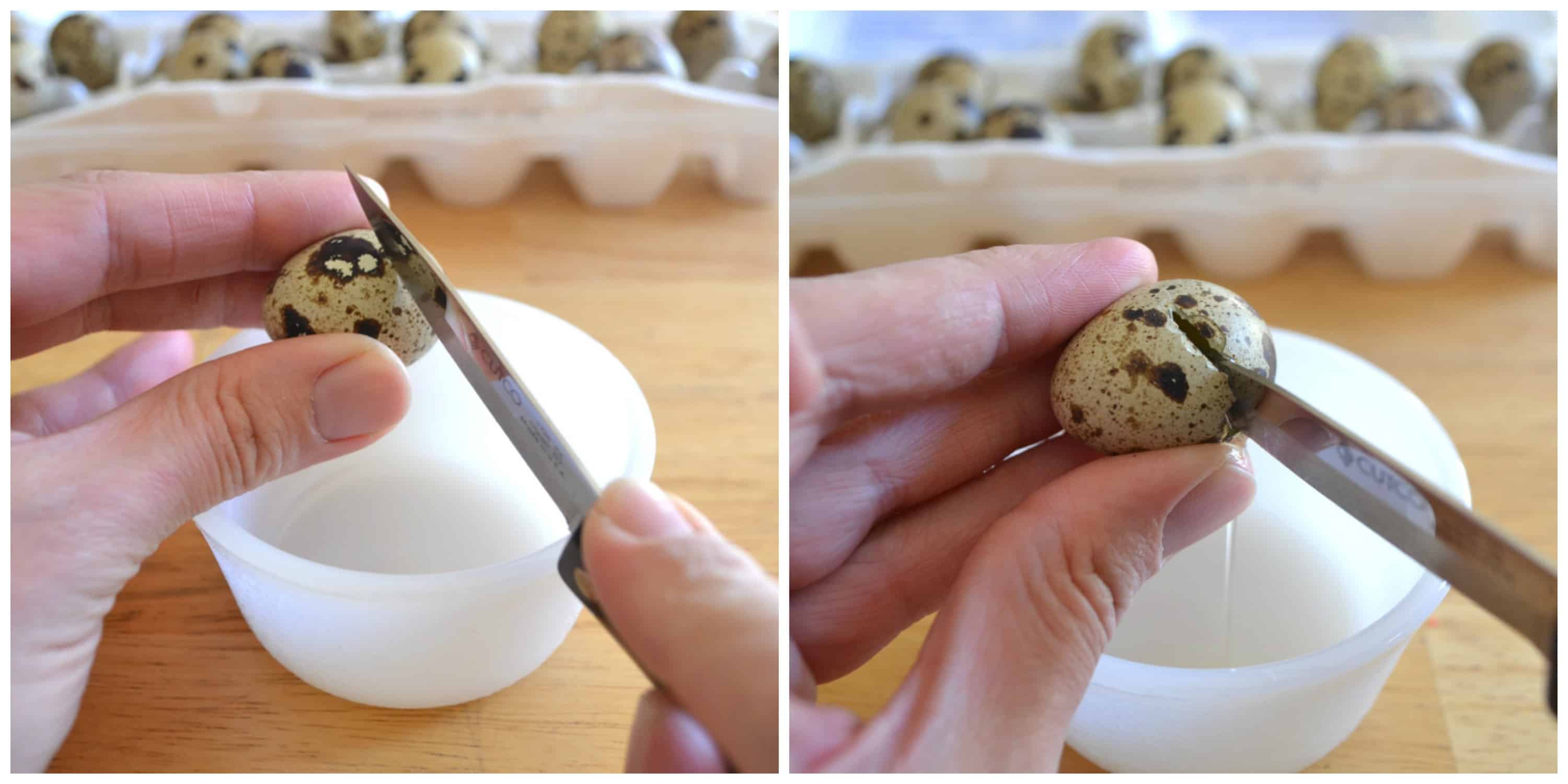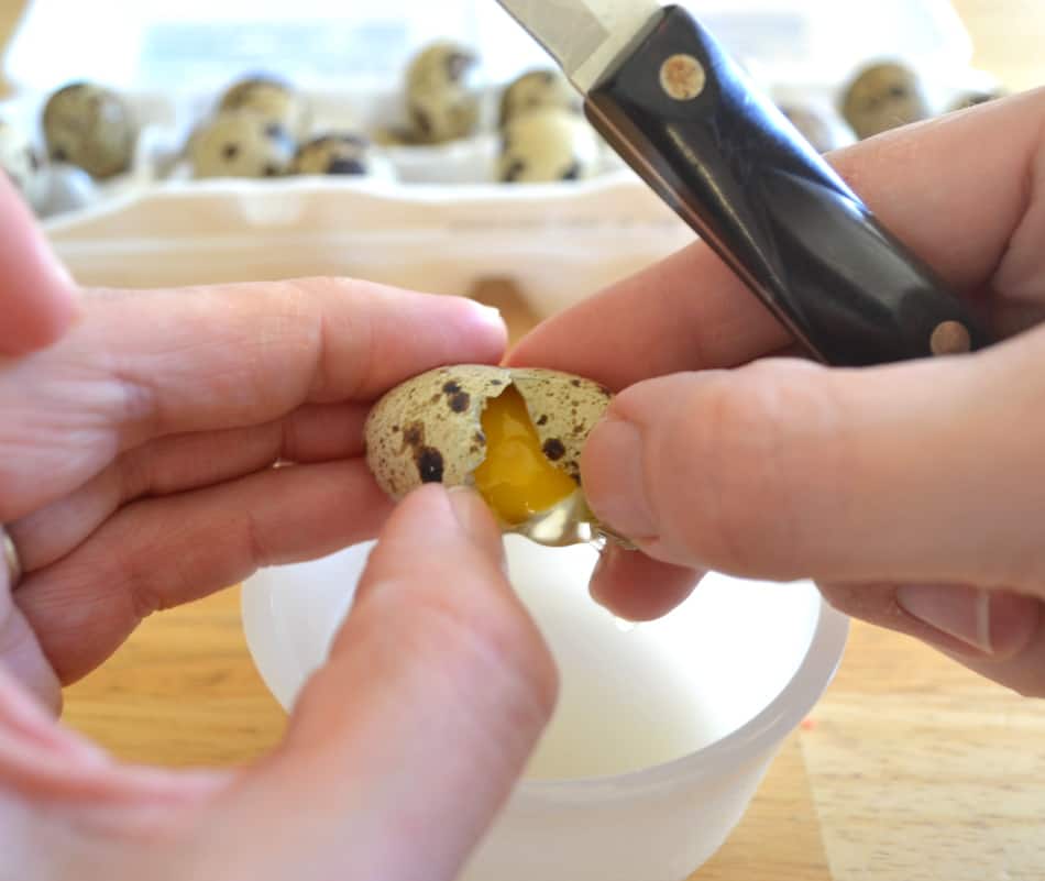 Quail eggs are a bit tricky to crack, but I’ve found a small sharp knife does the trick. I crack it with the knife & then cut it open. I crack a few at a time in a bowl and pour into my pan for over easy quail eggs.