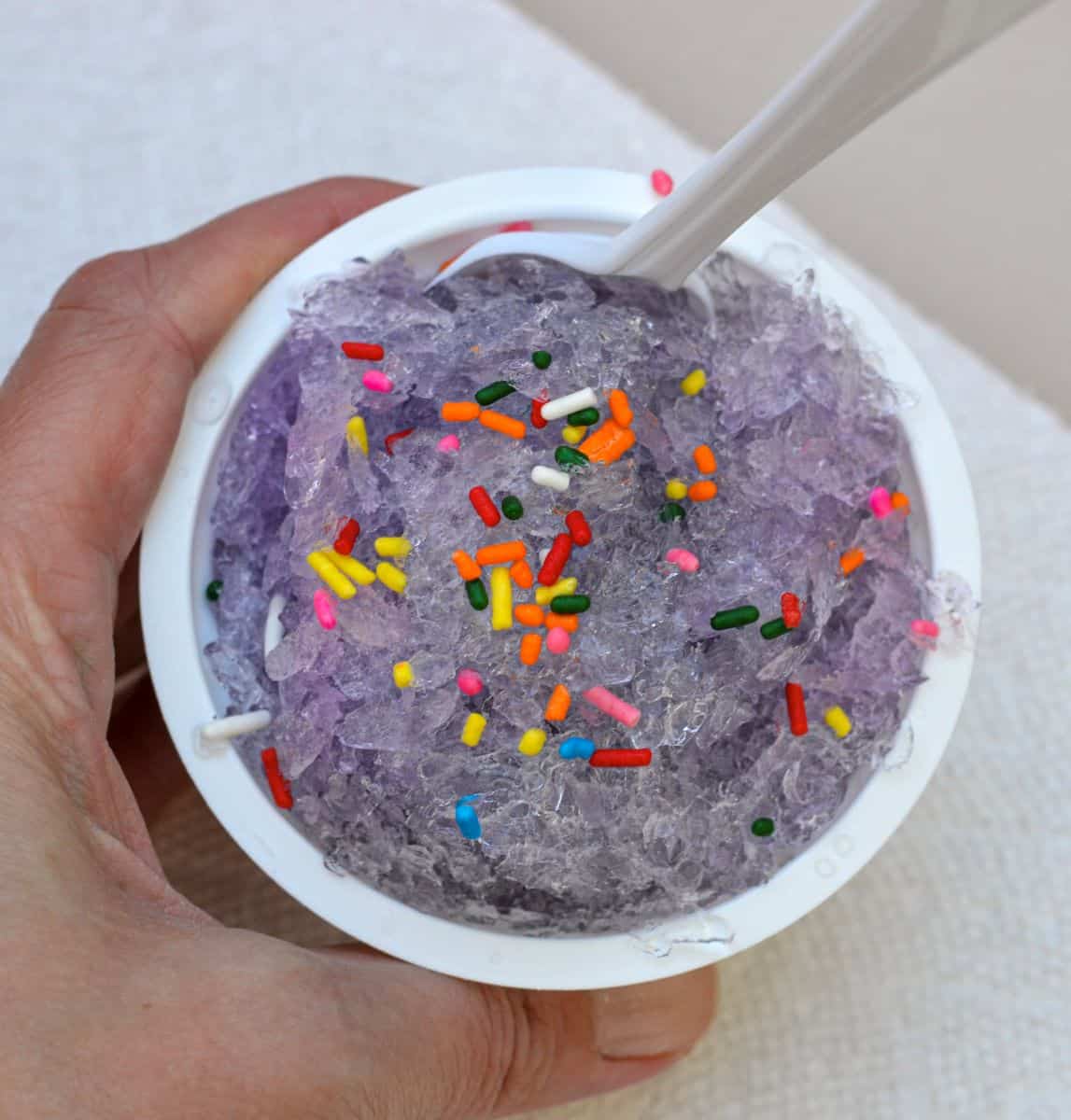 We enjoyed using the syrups that came along with the machine – Cherry, Cotton Candy & Pina Colada. These syrups have the exact taste you’ll find at your Shaved Ice Stand. Drizzle lightly all over the top. You want a fluffy shaved ice – not a cold syrup soup.