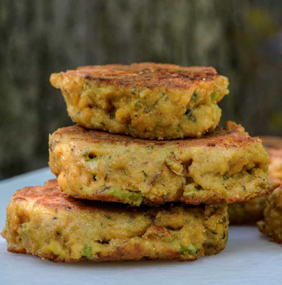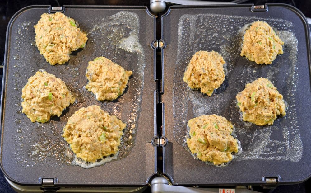 I add a generous amount of butter to my griddle. I scoop the patties with a spoon and lightly pat & roll to form a solid patty. Aim for 6 -8 patties.