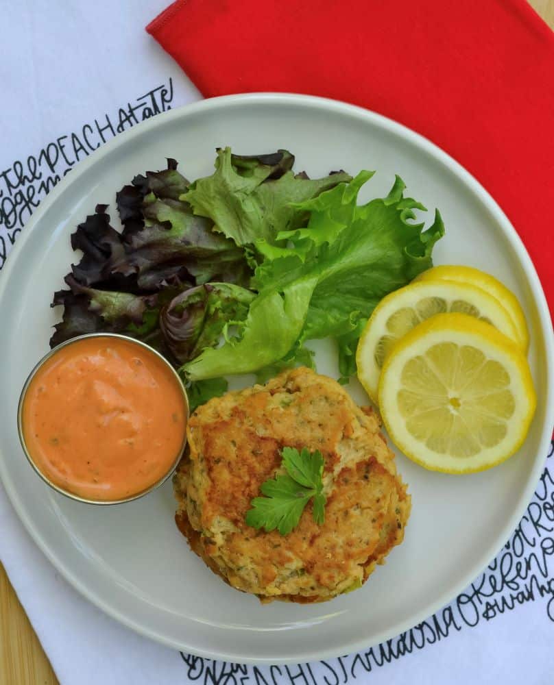 - (Optional) Serve with lemon slices, greens or with veggies. As for dipping sauces – cocktail sauce, tarter sauce, remoulade sauce – whatever you like! Here I served these with a quick sauce I mixed up – mayo, relish & sriracha.