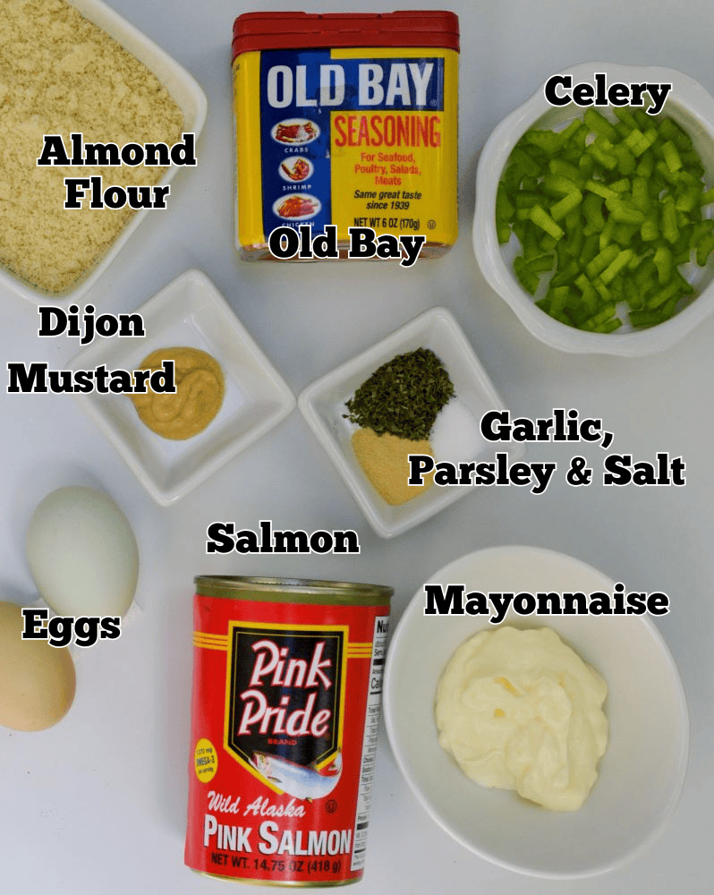 - Combine salmon, almond flour, eggs, mayonnaise, celery, mustard, Old Bay seasoning, garlic, parsley, salt & pepper. Mix until combined