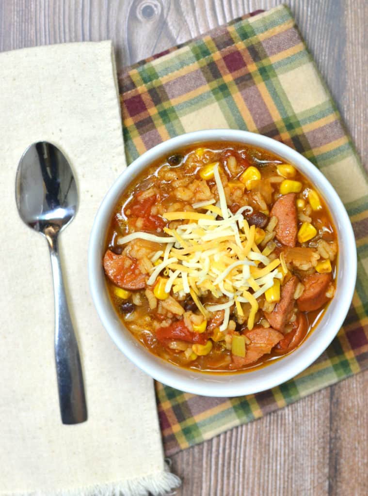 Throw together this quick, easy, tasty & hearty Kielbasa Chili! Minimal prep with kielbasa, jarred salsa & canned goods make it an effortless meal!