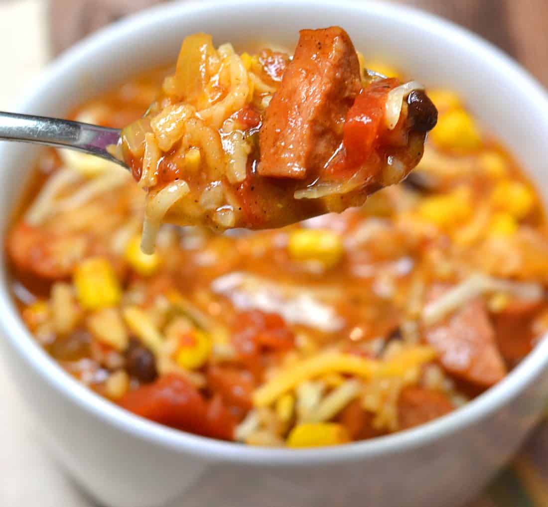 • Add kielbasa, salsa, diced tomatoes, corn, beans, chili powder, cumin, salt, chipotle powder & black pepper. Bring to a simmer, stirring occasionally.
