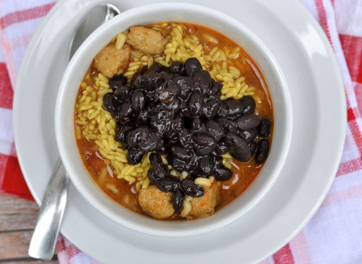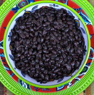 My favorite is simple – a bowl of white rice, black beans and shredded chicken or pork. I usually season the beans more when I serve with rice – more herbs, garlic and sazon. Throw some pimento stuff olives on there too – they pair fabulously with black beans.