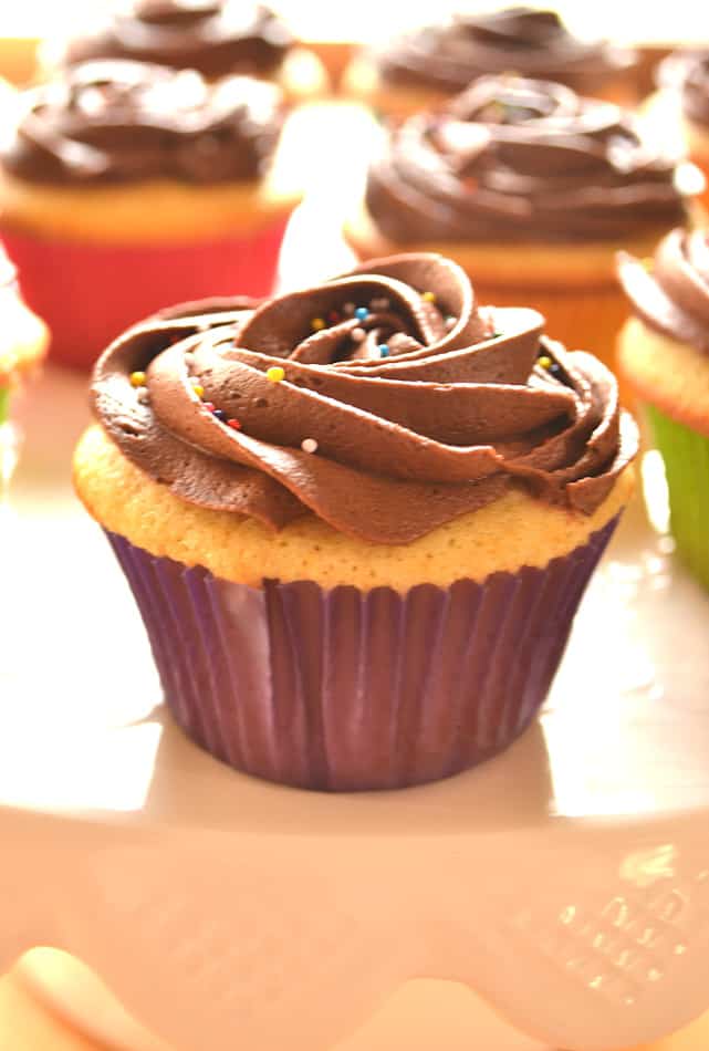 One Dozen Yellow Cupcakes with Chocolate Buttercream Frosting | Simple & Delicious | www.craftycookingmama.com