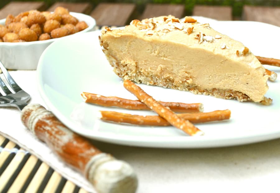 Sweet and salty peanut butter cheesecake pie in a pretzel crust | Rich & creamy with a crunch | So easy – pie filling is no bake | craftycookingmama.com