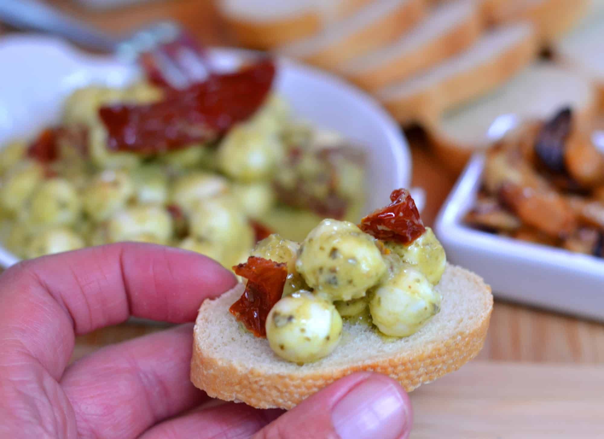 Need some quick hors d’oeuvres or a variety of light bites? Toss together pesto, mozzarella balls & a few chopped sundried tomatoes. Delicious! I like to serve it with baguette slices & roasted garlic.