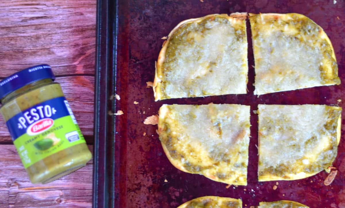 Looking for a quick meal? Pesto flatbread pizza! Spread pesto on flatbread, sprinkle with cheese and bake until bread is crisp and cheese is melted.