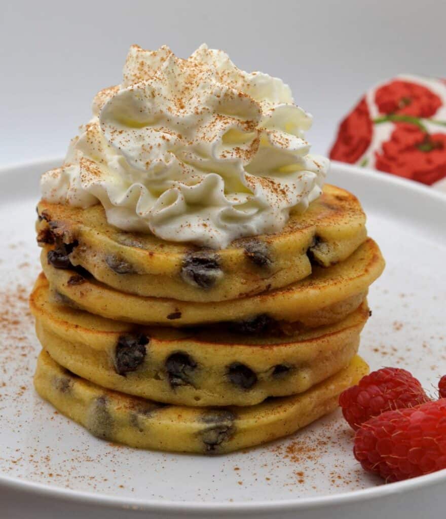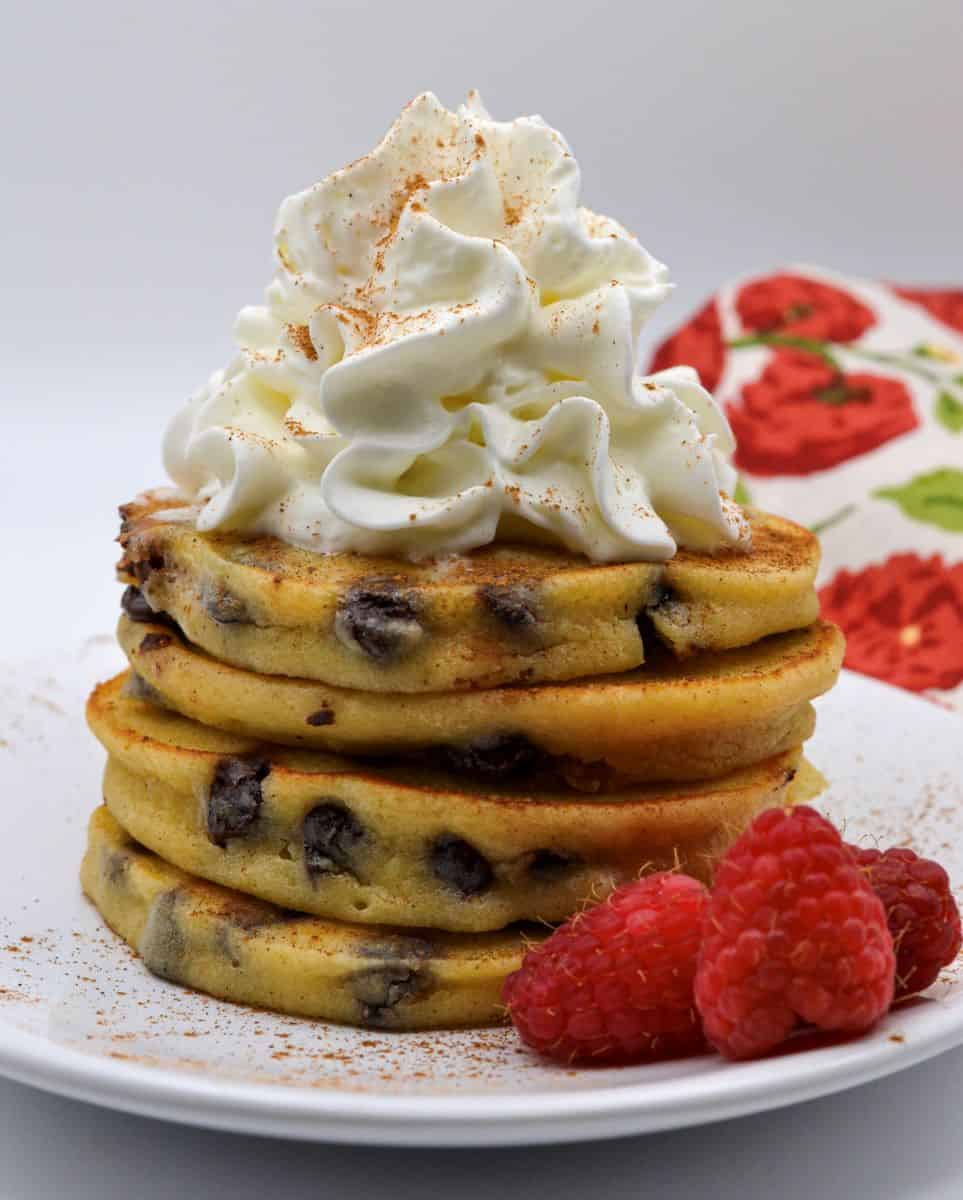 Rich, delicious Cannoli Pancakes. Made with ricotta cheese, cream, chocolate chips & cinnamon. I serve with jams or topped with whipped cream – they make a fabulous breakfast, brunch, dessert or anytime treat!