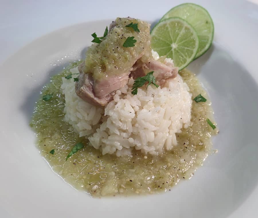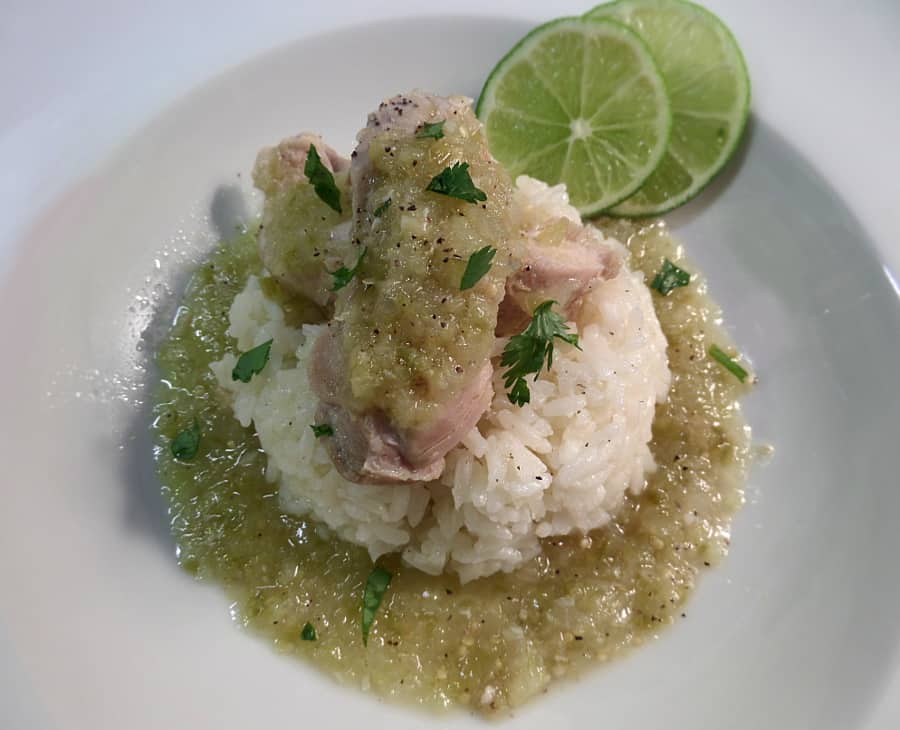 Outcome – delicious! Taste is crisp, light and tangy – tomatillos have a flavor all of their own. Chicken is juicy and tender. Serve chicken over white rice with lots of “salsa” from the skillet. Love it! Muy bueno!